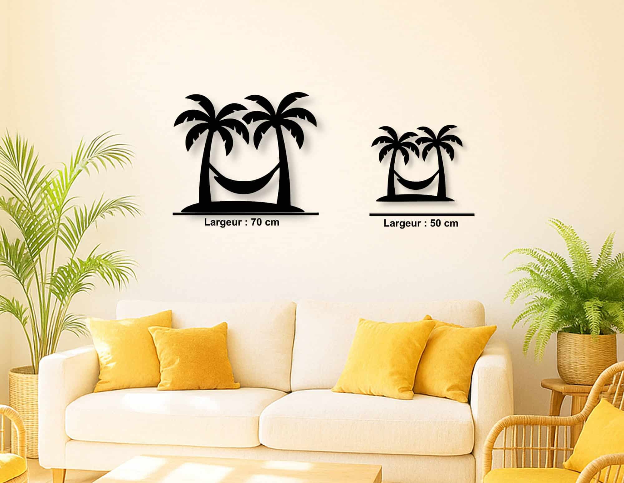 Apportez une touche d'exotisme et de sérénité à votre intérieur ou extérieur avec la décoration murale en métal « Palmier et Hamac ». Son design épuré et symbolique évoque la tranquillité d'une île déserte, créant un point focal apaisant dans votre salon, bureau ou terrasse.